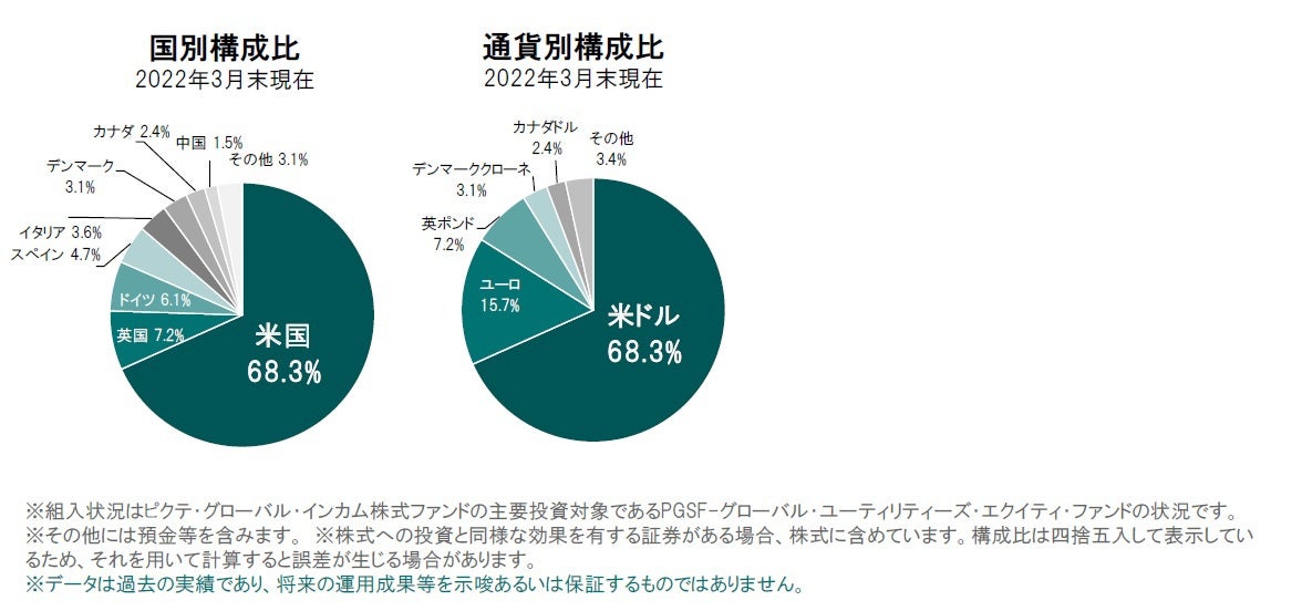 当ファンドは世界の公益企業が発行する株式を主な投資対象としています。2022年3月末現在の国別構成比では米国の構成比が高く、次いでユーロ圏の国の構成比が高くなっています。