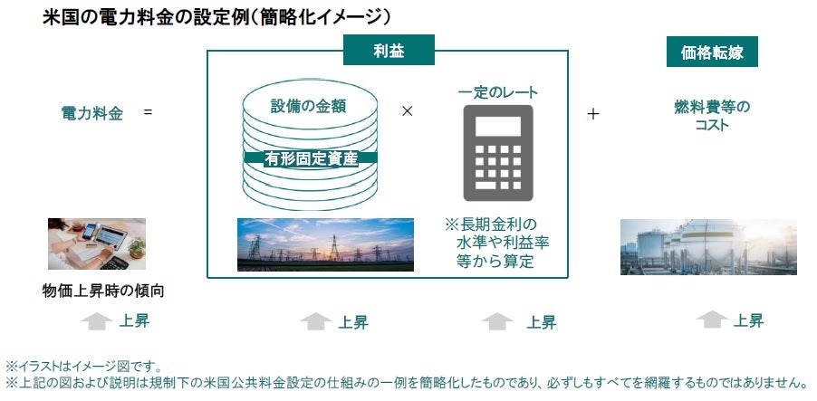 公益企業の収益のもととなる、公共料金の設定の仕組みは国や地域によって異なりますが、米国の規制下の電力料金の決定の例を簡略化してみると、電力料金はその企業の持つ設備(有形固定資産)の金額に長期金利の水準や利益率等を勘案し算定、認可される一定のレートを掛け、それに燃料費などのコストを加えて決定されます。したがって、これらの要素は物価上昇時には公益企業の増収増益要因となり易い仕組みとなっています。