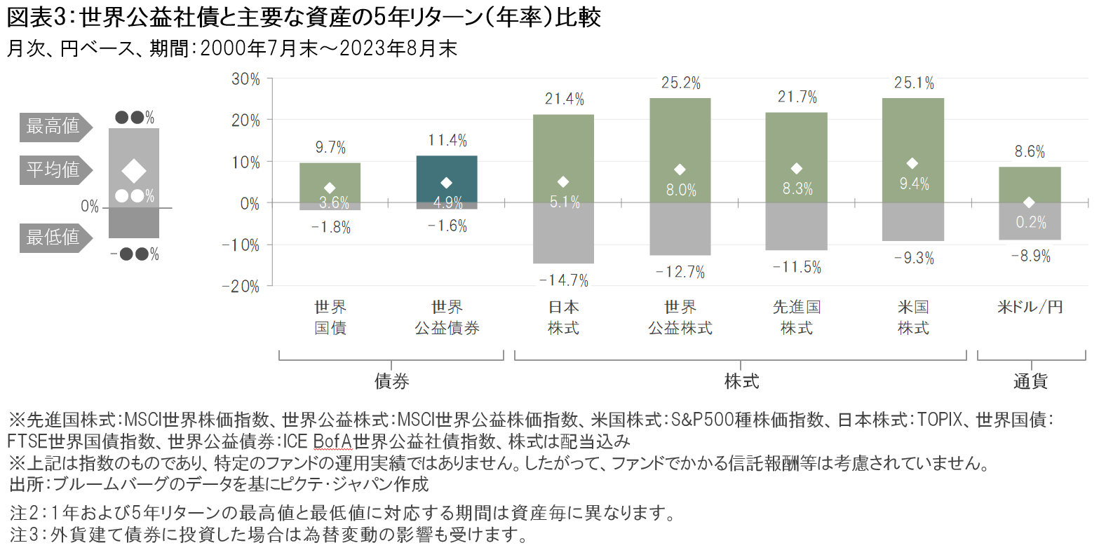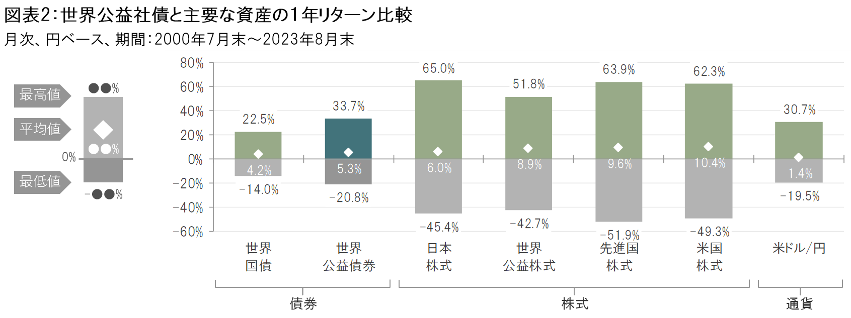 図表2は、世界公益債券と主要な資産について、それぞれ1年間保有した場合のリターンを比較したものです注2。これを見ると、平均値や最高値の水準からは株式のリターンが債券と比較して相対的に高かったことが示されていますが、最低値が示す下落率についても株式が相対的に大きかったことが分かります。なお、いずれの資産の最低値も2008年9月の米大手投資銀行のリーマン・ブラザーズの破綻を契機とする世界金融危機(リーマン・ショック)の影響を受けた期間を含む下落率となっています。