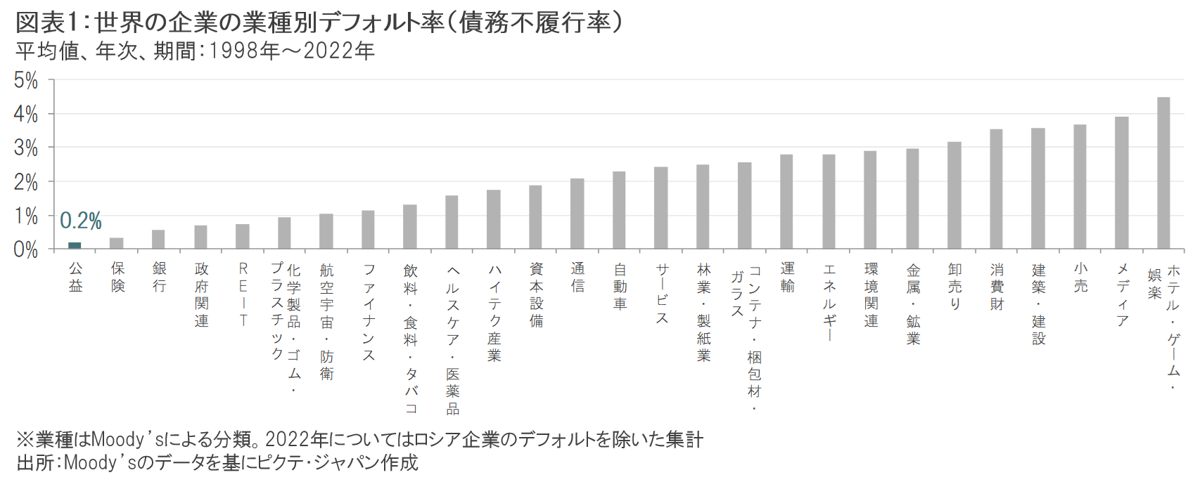 ・公益企業は安定した事業基盤を持ち、デフォルト率が低い傾向がある