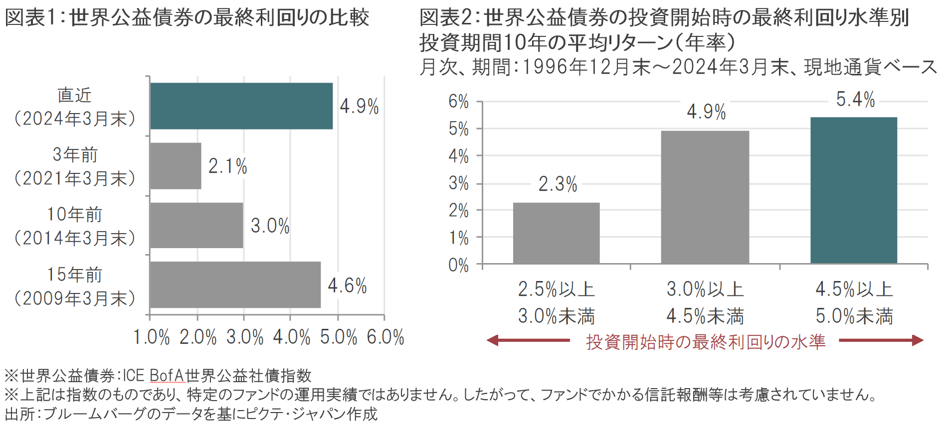 足元の世界の債券市場の投資環境を見ると、近年の主要国の利上げを背景とした金利上昇に伴い、世界公益債券の最終利回りが約15年ぶりの高水準となっています(図表1参照)。