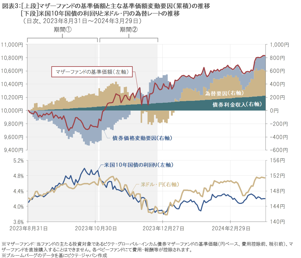 その後の2023年12月末にかけての期間(期間②)には、米国など主要国の金利低下に伴い、組入れている債券の価格が上昇したことから「債券価格変動」要因がプラスに転じ、マザーファンドの基準価額の上昇に寄与しました。