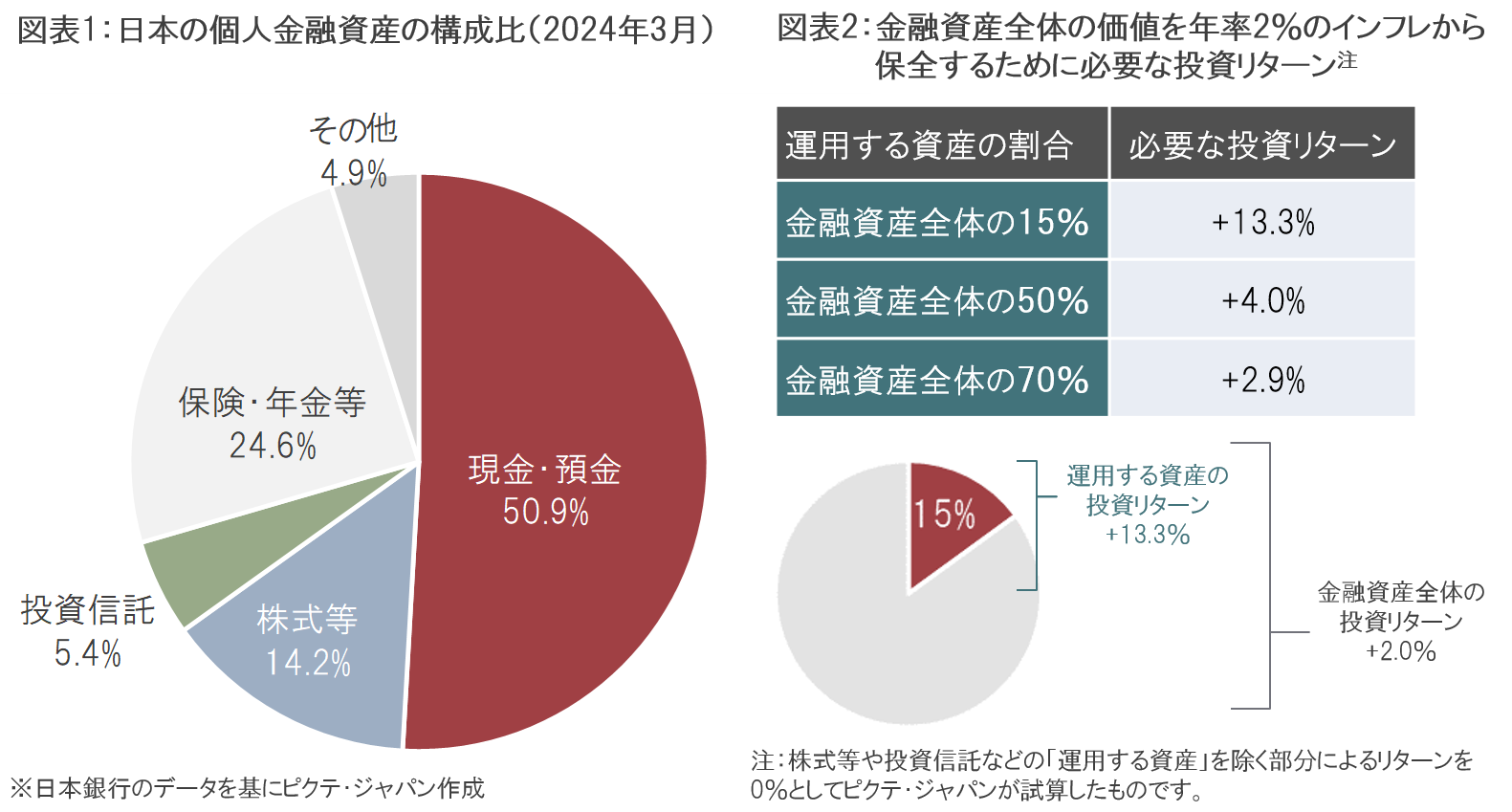 図表2に示す通り、インフレ率を年率2%と仮定した場合、金融資産全体の15%を運用してインフレから金融資産全体の価値を守るためには、年率13%の程度のリターンが必要です。一方、運用する金額の割合を金融資産全体の70%に高めると、必要なリターンは年率3%程度になり、積極的なリターンを追求しなくても、インフレから金融資産を守る運用が可能であるということが分かります。