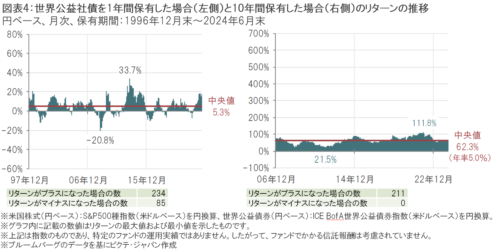 図表4の左側は、同期間において、世界公益債券(円ベース)を1年間保有した場合のリターンの推移です。中央値は5.3%で、図表3の米国株式と比較して相対的に低水準ですが、その一方でリターンの振れ幅も相対的に小さいことが分かります。一般的にリスクが低いとされる債券であっても、市場環境によっては変動が大きくなる可能性があるため、短期的な損失を許容しながら長期投資を継続する必要がありますが、図表4の右側の10年間保有した場合のリターンの推移では、リターンの下振れリスクが抑制される傾向が示されています。このように、相対的に安定したリターン特性を示す世界公益債券への投資は、金融資産全体を考慮した資産運用の設計において、選択肢の一つになると考えられます。