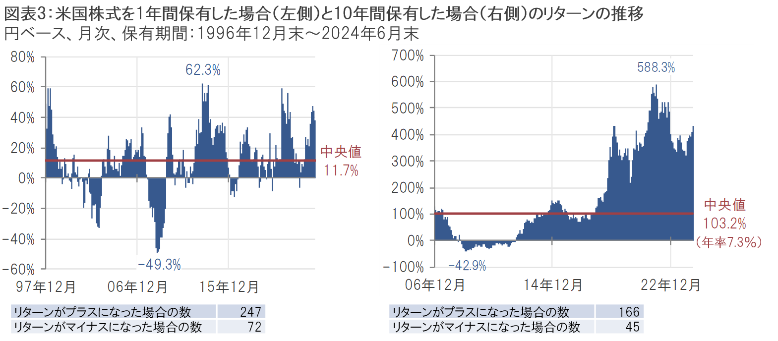 図表3は、1996年12月末以降の期間において、米国株式(円ベース)を1年間保有した場合のリターンの推移(左側)と、10年間保有した場合のリターンの推移(右側)を示したものです。1年間保有した場合のリターンの中央値は11.7%で、前ページの「金融資産全体の15%を運用して2%のインフレから金融資産全体の価値を守るために必要なリターン」の13%程度に近い水準となっています。ただし、リターンの振れ幅が大きく、リスクの水準も高いことが示唆されているため、必要とされる水準を大きく上回るリターンが獲得できる可能性がある一方で、大幅な損失が生じる可能性もあると言えます。10年間保有した場合でも、投資を開始したタイミングによってはリターンがマイナスになることがありました。