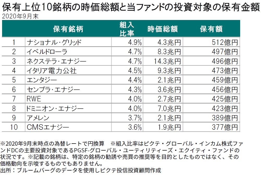 当ファンドの投資対象であるピクテ・グローバル・セレクション・ファンド-グローバル・ユーティリティーズ・エクィティ ファンドの純資産総額は2020年9月末で1.1兆円と世界の公益株式関連ファンドの純資産ランキングで2位となっています。 ※全世界の株式のうち主要クラス、アクティブ、業種重視型(公益事業)ファンド109ファンド中のランキング 出所:ブルームバーグ