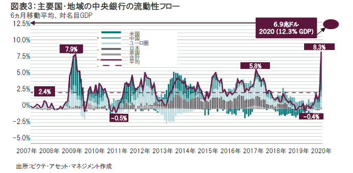 米連邦準備制度理事会(FRB)の流動性供給は主要国・地域の規模を上回り、リーマンショック時を上回る規模の流動性供給が想定されます(2頁図表3参照)。