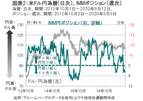 これは、ドル安・円高要因となると考えられるものの、足元ではドル売り・円買いのボジションが積みあがり(2頁図表2参照)、決済通貨としてのドル需要逼迫とのバランスから、ドルは当面底固いと見ています。