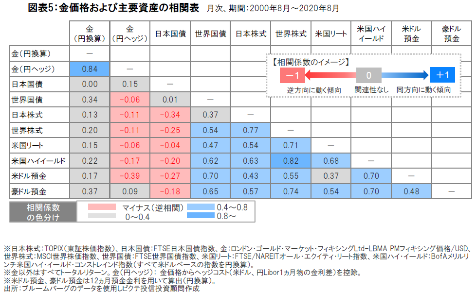 その債券の代替として注目されるのが金です。金は主要資産に対し、相関係数は0(ゼロ)に近い値となっており、双方の値動きに関連性がほとんどありません(図表5参照)。