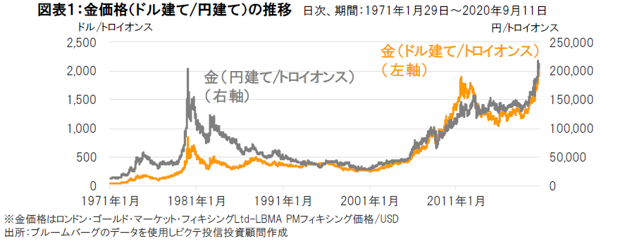 2020年8月5日、ロンドン地金市場協会(LBMA)が公表する金価格は、はじめて2,000米ドル(1トロイオンスあたり)を突破し史上最高値を更新、現在も1,900米ドル台後半での推移となっています(図表1参照)。