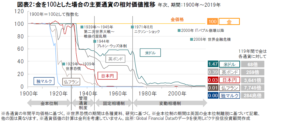 金と主要通貨の相対価値を遡ると、金に対する通貨の価値が大きく下落した局面が数回あった(図表2参照)一方で、金はその価値を維持し、圧倒的な「価値貯蔵」力を見せてきました。金利を考慮しないと仮定すれば、歴史は「金が最強の通貨」である、ということを示していると考えられます。
