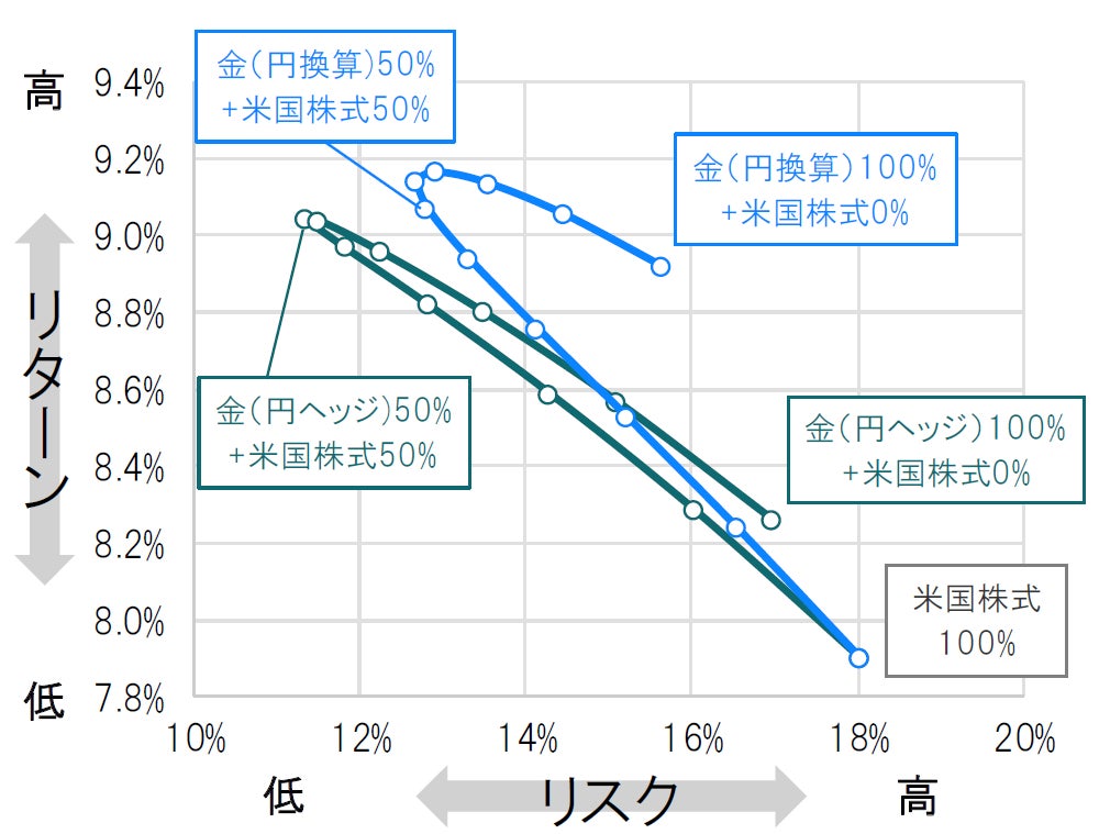 図表3:金と米国株式の持ち合わせによるリスク・リターンの変化