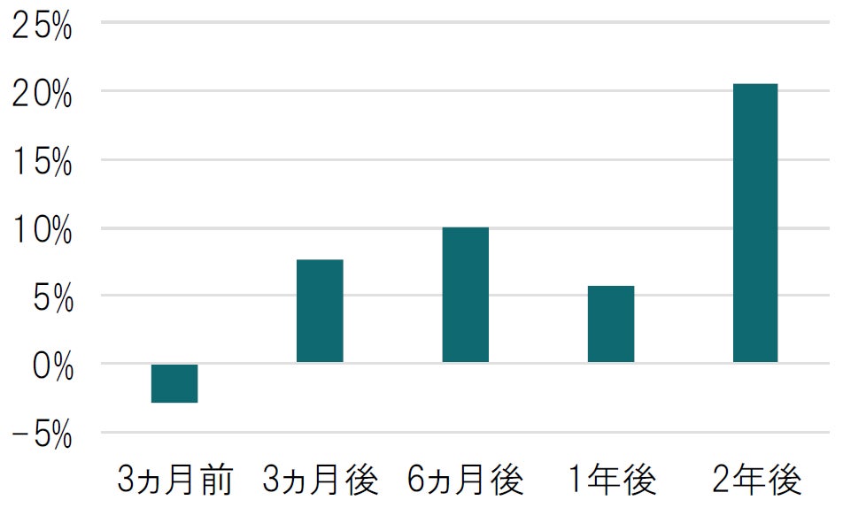 米ドルベース、過去利上げが開始された1994年2月4日、1999年6月30日、2004年6月30日、2015年12月16日を基点として、3ヵ月前、3ヵ月後、6ヵ月後、1年後、2年後の金価格の騰落率の平均値