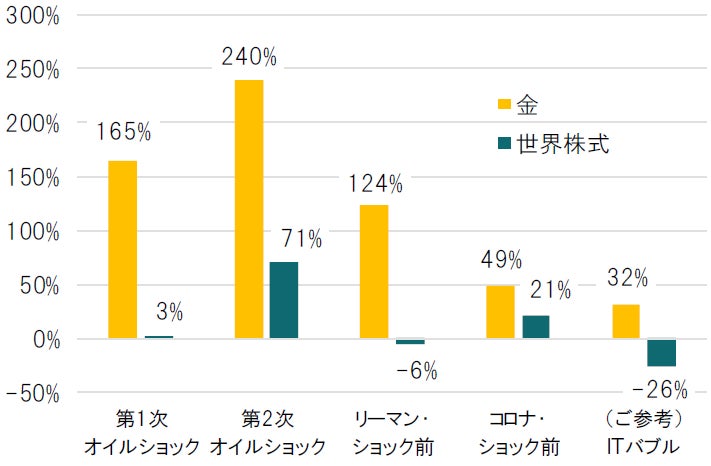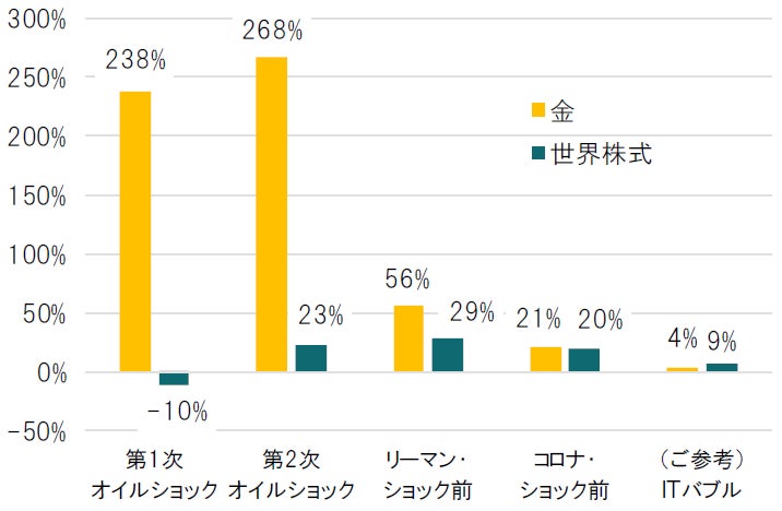 一方、インフレ水準が相対的に低かったITバブルの時の利上げ局面では、金の騰落率は世界株式を下回る水準にとどまりました。