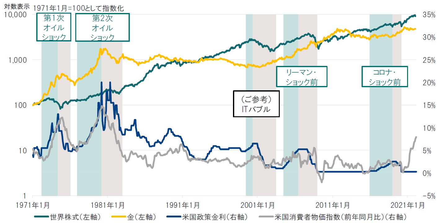 月次、金および世界株式は米ドルベース、期間:1971年1月~2022年2月