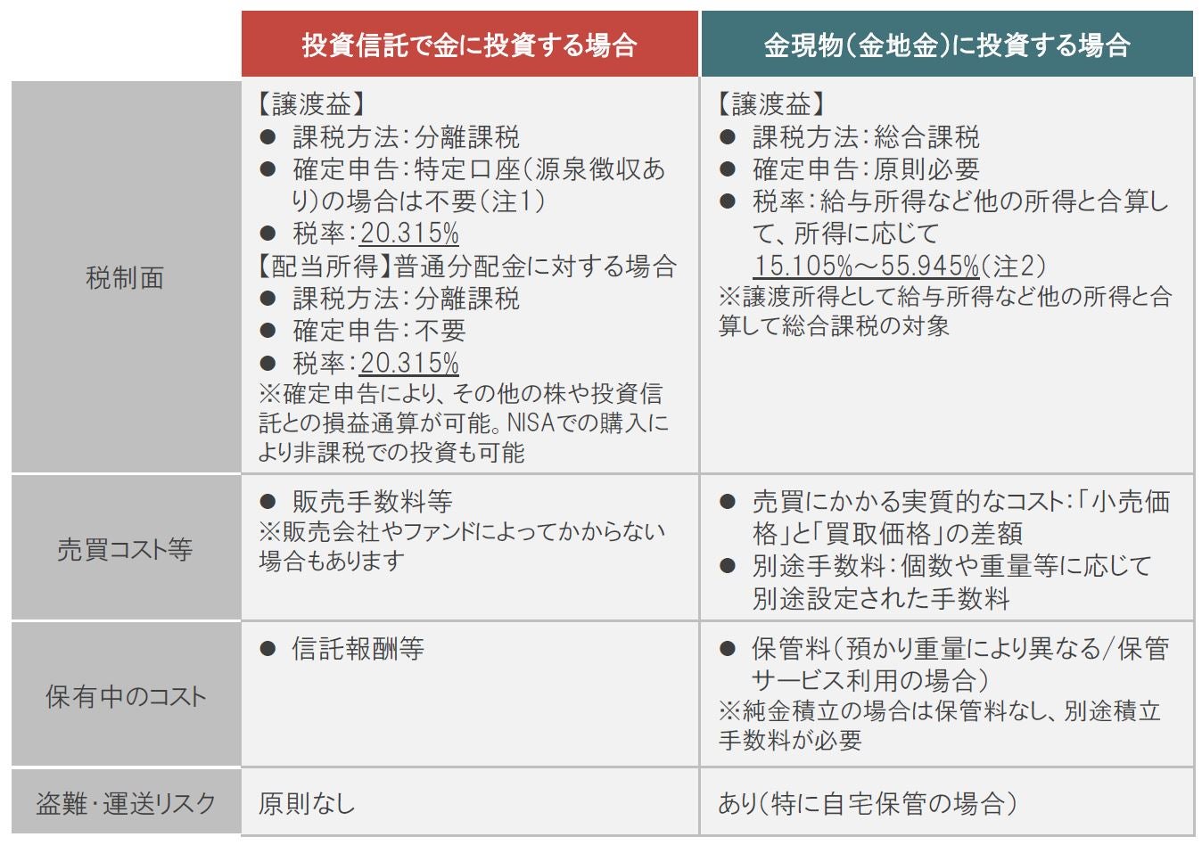 ●投資信託の場合は、特定口座(源泉徴収あり)にて発生した譲渡益は確定申告不要であるほか、NISAも活用できるため、金現物と比べ税制面、保有面での手軽さが特徴です。
