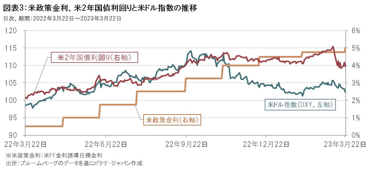 米国やスイスの金融当局は預金者保護や金融機関向け緊急融資枠の設定などにより、信用不安の拡大を阻止する考えを示し、事態の鎮静化を図っていますが、SVBの経営破綻の背景には、インフレ率の高止まりを背景にFRBが急速に金融引き締めを進めてきたことで、SVBが保有する米国国債などの資産に含み損が生じていたことなどが指摘されています。そのため、金融システムや景気への配慮からFRBが金融引き締め姿勢を緩和させるとの観測が強まりました。その後、3月21日から22日にかけて行われた米連邦公開市場委員会(FOMC)では0.25%の利上げが決定されましたが、声明文では引き続きインフレ抑制を重視する姿勢が示された一方で、今後の利上げについて複数回を示す「継続的な」という表現が除外され、利上げサイクルの最終局面にあることが示唆されました。