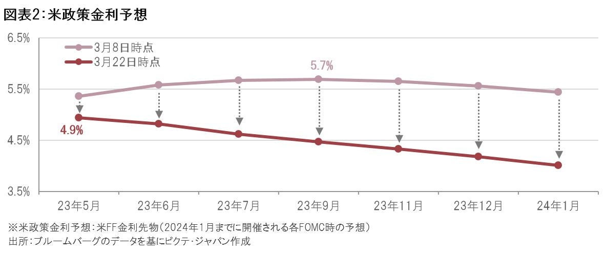 市場参加者による米政策金利の予想を示す米FF(フェデラル・ファンド)金利先物を見ると、SVBの経営破綻など金融不安が表面化する前の3月8日時点では、利上げ局面における政策金利の最終的な到達点であるターミナルレートは5.7%程度(2023年9月)が予想されていましたが、直近のFOMCが開催された3月22日時点ではターミナルレートは4.9%程度(2023年5月)にまで低下し、次回(5月)のFOMC以降はFRBが利下げに転じると予想していることがわかります(図表2参照)。