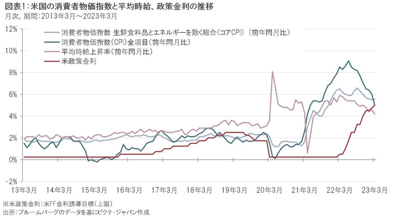 米国では、インフレの高進を受けて米連邦準備制度理事会(FRB)が継続的な利上げを実施してきましたが、足元では消費者物価指数や賃金の伸びなどのインフレに関連する指標にピークアウトの兆しがみられています(図表1参照)。また、2023年3月に生じた米国の地銀の破綻をきっかけとする金融不安に代表されるように、金利上昇による実体経済への影響が顕在化するには通常、時間差を伴います。そのため、FRBの金融政策は今後、これまでの利上げの累積的な効果を見極める期間に移行することが予想されます。