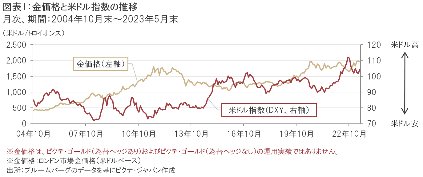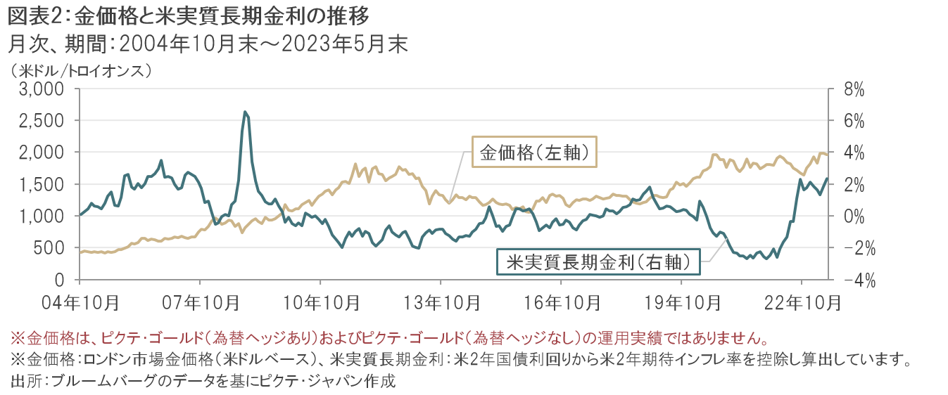 まず金価格と米ドルとの関係では、金は一般的に米ドルの代替資産と見なされるため、米ドルが主要通貨に対して下落した場合、金の相対的な魅力が向上したととらえられ、金価格は上昇する傾向にあります。図表1は金価格と米ドル指数注2の推移を示したものです。すべての期間において該当するわけではありませんが、米ドル指数の下落局面では金価格が上昇し、米ドル指数の上昇局面では金価格が下落する傾向が見て取れます。