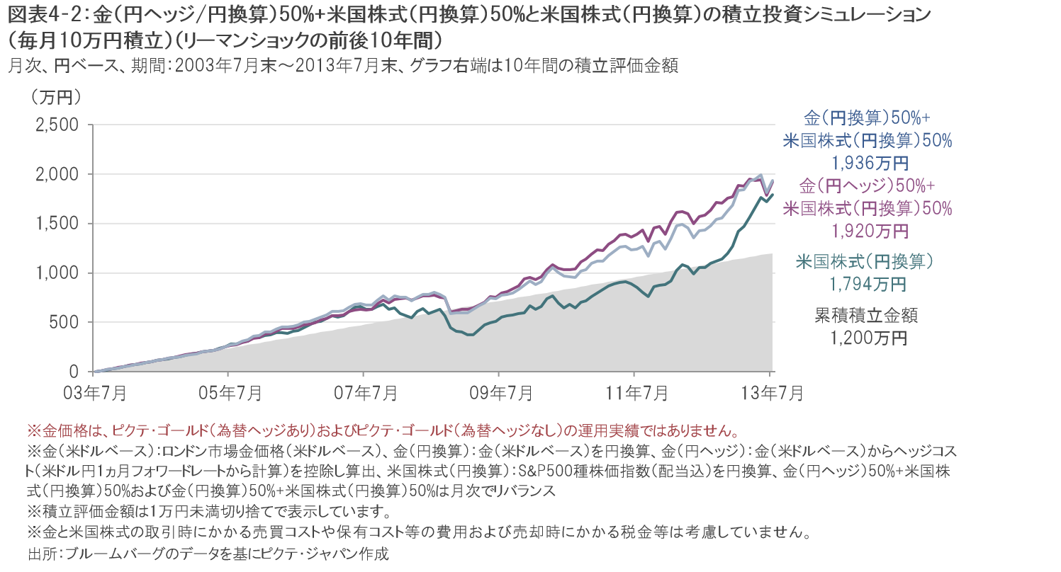 この背景としては、金を組合せていたことで、リーマン・ショック時(2008年)のような金融市場の混乱時に米国株式の単体投資よりも下落率が抑えられたことがあげられます。
