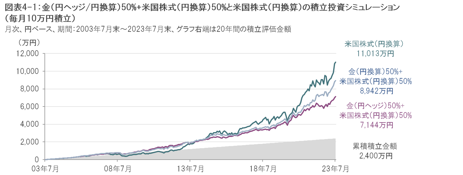 毎月10万円を米国株式に全額投資した場合と、米国株式に5万円(50%)、金(円ヘッジ/円換算)に 5万円(50%)投資し、月次で投資比率のリバランスを行った場合の20年間の積立シミュレーションが図表4-1です。米国株式と金の同額積立は、分散投資とリバランスを行っていることもあり、20年間のパフォーマンスが良好であった米国株式への全額投資の場合の積立評価金額を下回っています。