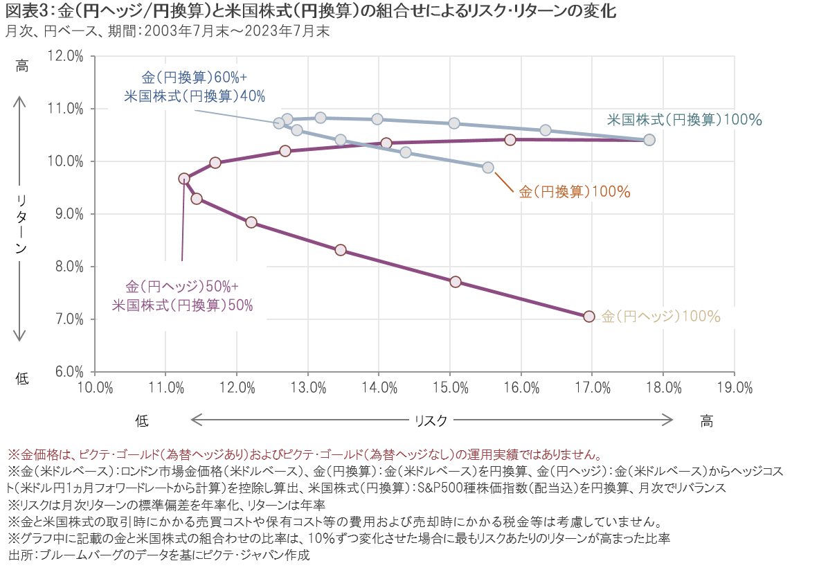 米国株式と金の組合せ比率を10%ずつ変化させた場合のリスク・リターンの変化(図表3)をみると、米国株式に対し金の保有比率を上げていくと(米国株式50%、金50%あたりまで)、リスクが低下する一方、米国株式(円換算)と金(円換算)の組合せではリターンが上昇していることがわかります。また、米国株式(円換算)と金(円ヘッジ)の組合せでは、リターンが米国株式と比較して低下しているものの、リスクがより大きく低下したため、リスクあたりのリターンが高まりました。