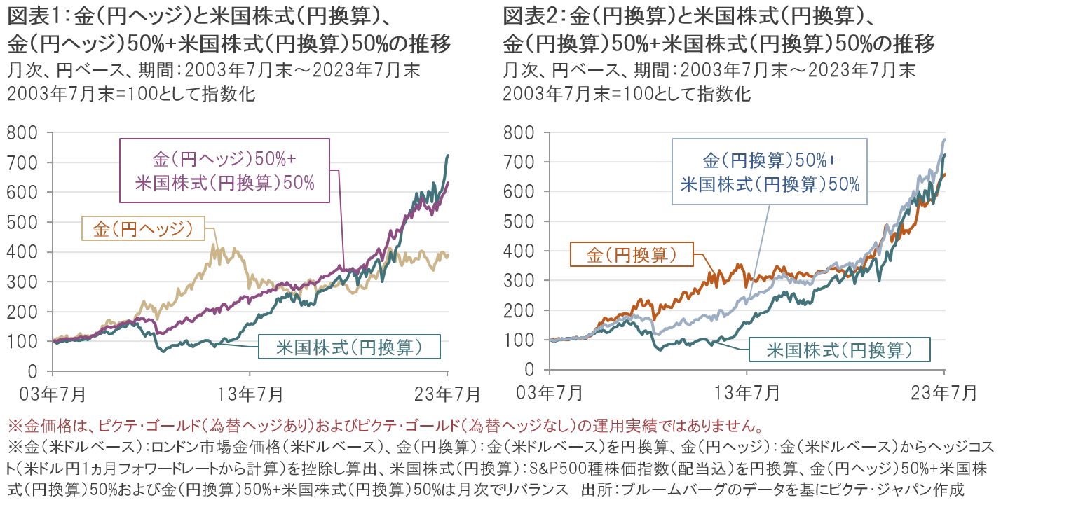 一例として日本の投資家にも人気の高い米国株式と金を組合せて投資した場合の効果を見てみましょう。米国株式と金を同額(50%ずつ)保有した場合の過去20年間のパフォーマンスのシミュレーションの結果が図表1と図表2で、図表1は米国株式(円換算)と金(為替ヘッジをしたもの、以下、円ヘッジ)、図表2は米国株式(円換算)と金(為替ヘッジをしていないもの、以下、円換算)を組合せたものです。