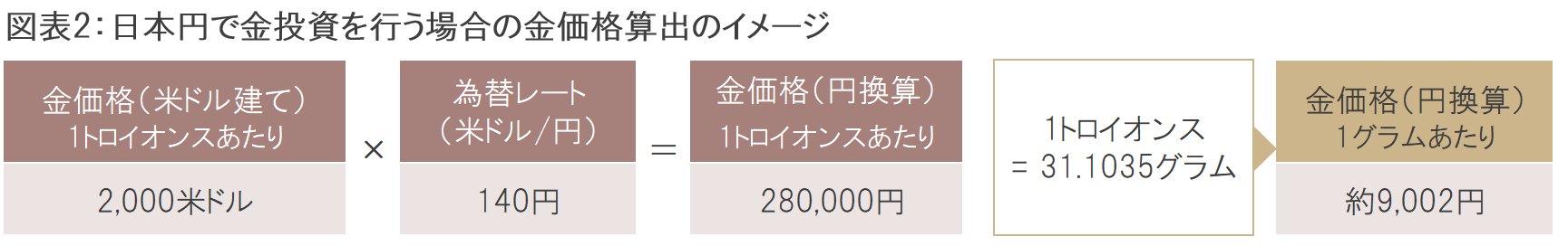 金価格は1トロイオンス(約31.1グラム)あたりの米ドル建てで表されますが、日本の貴金属商(〇〇貴金属など)では、この金価格を米ドル建ての日本円とグラムに換算して発表しており、「日本国内での金の小売価格が過去最高値を更新した」といった報道などでも取り上げられています(図表2参照)。
