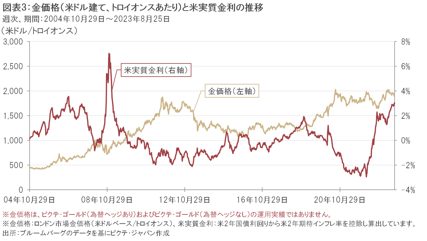 米ドル建ての金価格は2023年5月上旬に過去最高値に迫る1トロイオンスあたり2,044米ドルを付けましたが、それ以降は米連邦準備制度理事会(FRB)が今後も追加利上げを実施するとの観測などを背景に米国金利が上昇したことなどから下落し、8月下旬にかけては上値の重い展開となりました。実物資産である金は金利を生まない資産であるため、金利が上昇すると金の相対的な魅力が低下し、金価格は下落する一方、金利が低下すると金価格は上昇する傾向にあります。図表3は金価格と米国の実質金利の推移です。これを見ると、すべての期間に該当するとは言えませんが、実質金利の上昇局面では金価格が下落し、実質金利の低下局面では金価格が上昇する傾向が見て取れます。