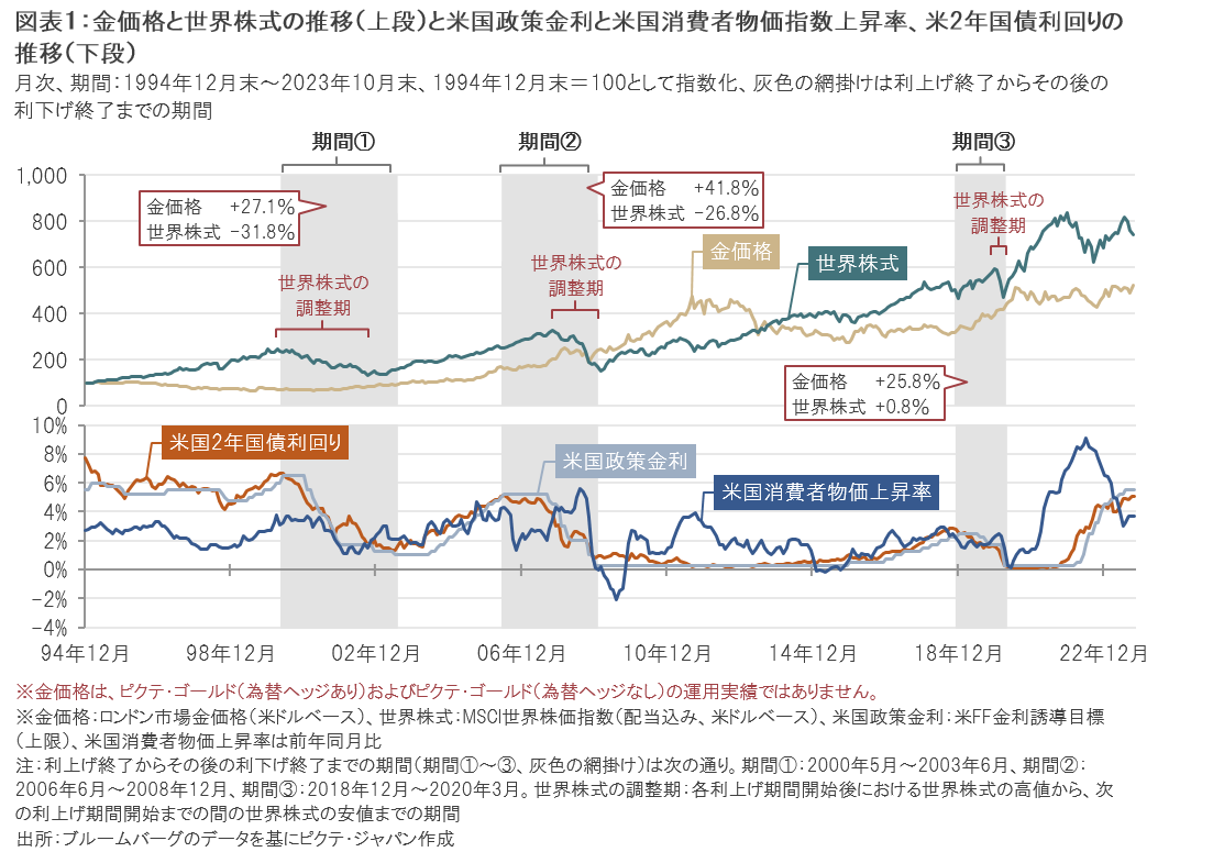 金価格の上昇の背景には、米国で利上げ局面が終わりを迎え、米国金利(債券利回り)と米ドルの一段の上昇期待が落ち着いたことにより、金利を生まず、米ドルの代替資産とみなされる傾向がある金の相対的な魅力が高まったことなどが考えられます。また、同期間中には世界株式が調整する場面が見られました。金融危機のような金融市場に混乱が生じる局面などでは、資金の逃避先としての需要が高まり、金に資金が流入する傾向があることが、金価格の上昇要因になったと考えられます。