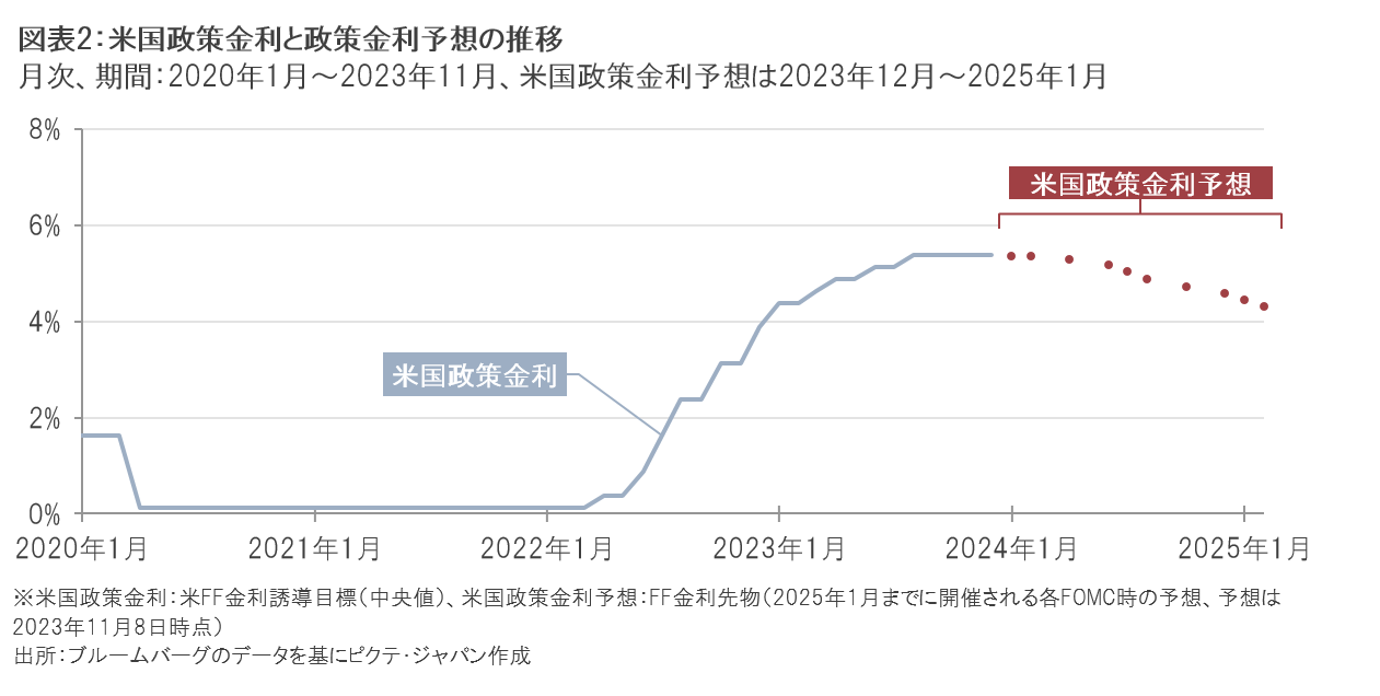 一方で、10月の雇用統計など足元の米国の経済指標からは、労働市場の減速感がみられるなど、インフレ圧力が徐々に和らぐ可能性があることが示されおり、利上げを継続する必要性が徐々に低下しつつあると考えられます。また、市場参加者による米政策金利の予想を示すFF(フェデラル・ファンド)金利先物の価格を分析すると、2024年1月のFOMC時点での政策金利の予想が最高水準となっています(図表2参照)。