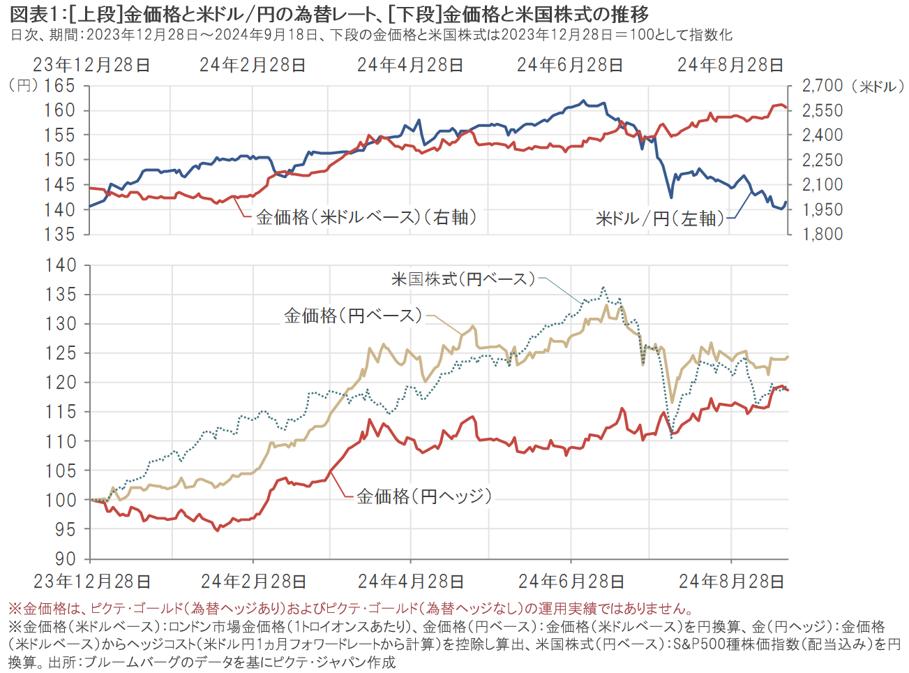 2024年年初より上昇基調となっている米ドルベースの金価格は、9月中旬に過去最高値を更新しました。一方、為替市場では7月中旬以降、円が米ドルなどの主要通貨に対して上昇し、円高・外貨安の傾向となっています(図表1[上段]参照)。金に投資を行う際には、為替ヘッジを行わない場合、金価格の変動に加えて、米国株式などへの投資と同様に米ドル・円の為替相場の影響を受けます(詳細はP3の「ご参考①」)。そのため、円換算後の「金価格(円ベース)」は7月中旬以降の円高・米ドル安の進行により下落しました。為替ヘッジを行った「金価格(円ヘッジ)」は、円高・米ドル安によるマイナスの影響が抑制されたことで、米ドルベースの金価格を概ねとらえる値動きとなり、相対的に底堅く推移しました(図表1[下段]参照)。