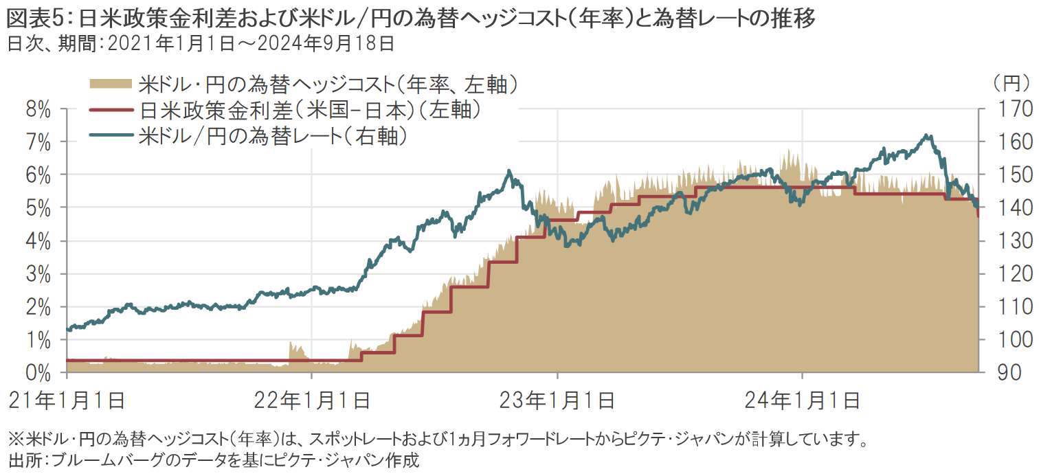 為替ヘッジを行う際には、通常、為替予約が用いられます。為替予約は、取引相手との間であらかじめ将来のある時点における交換レートを取り決めるものですが、その際の通貨間の短期金利差が為替ヘッジコストの主な決定要素となります注5。例えば、米ドル・円の変動リスクをヘッジする際、足元の環境のように円の短期金利が米ドルの短期金利よりも低い場合には取引相手に対して金利差分を負担する形になるため、為替ヘッジ「コスト」が生じます(図表5参照) 。一方、円の短期金利が米ドルの短期金利よりも高い場合には、取引相手から金利差分を受け取る形になるため、為替ヘッジ「プレミアム」となります。