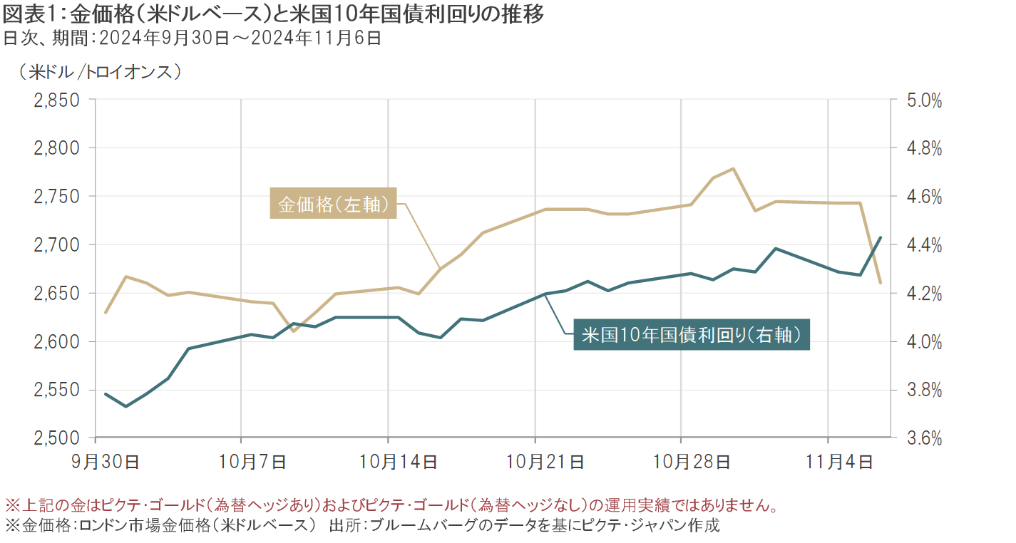 2024年11月6日(日本時間)に米国大統領選挙の開票が実施され、共和党のトランプ候補が勝利しました。金価格は、トランプ候補の優勢が伝えられる中で米国国債の利回りや米ドルが大きく上昇した影響に加え、米国株式などのリスク資産に資金が流入したことなどを受けて下落しました注1(図表1参照)。今後の金価格については、短期的には米国の金利や米ドルの動向の影響を受けて変動が大きくなることが想定されます。