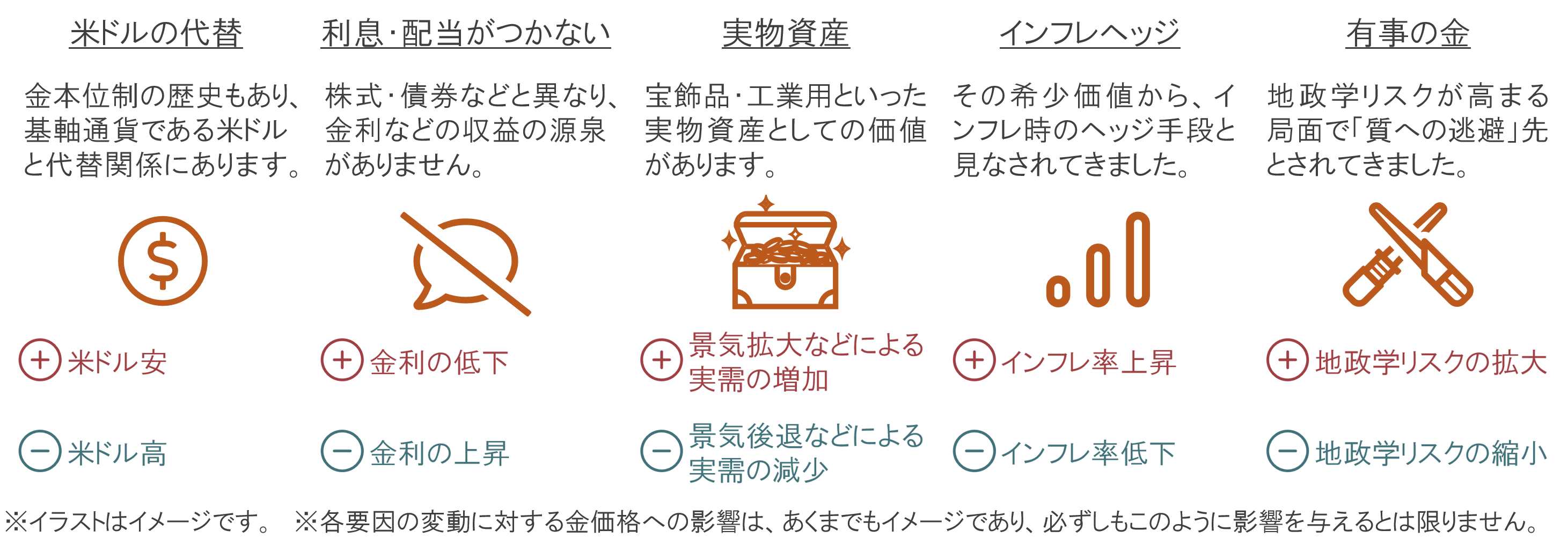 金には主に「実物資産」「利息・配当がつかない」「米ドルの代替」「インフレヘッジ」「有事の金」といった特徴があります。それらの特徴とその時々の世界経済や投資環境により、景気や金利などの変動要因の金価格への影響度合いが変わる傾向にあります。
