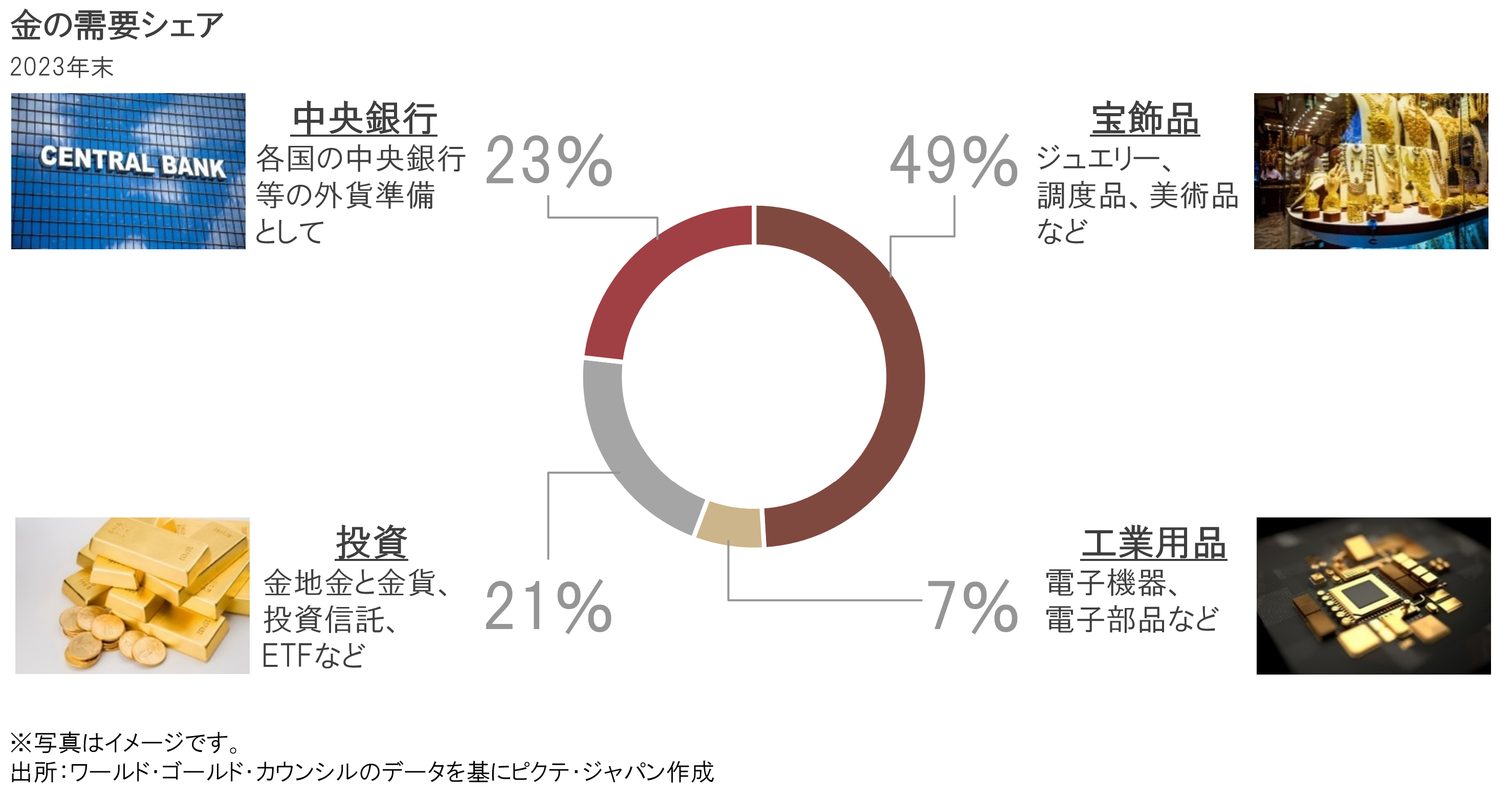 金の需要は大きく分けると宝飾品、中央銀行、投資、工業用品の4つに分かれます。