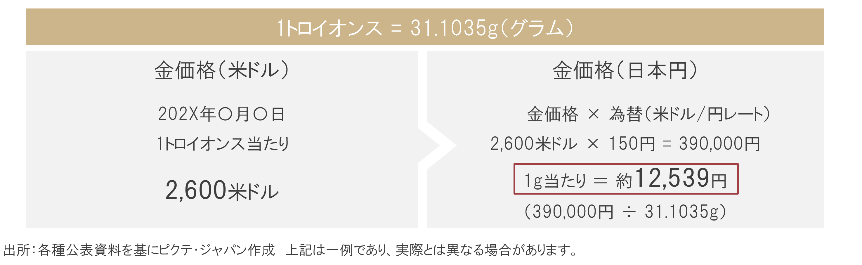 トロイオンスは金や銀などの貴金属の計量に使用される単位で、1トロイオンスは約31.1035gです。金は世界各地で取引されますが、基本的な通貨単位は米ドル建てで、「1トロイオンス当たりの価格(米ドル)」で表示されます。日本の金現物取引の際は、一般的に「1グラム当たり」で金価格が算出されます。