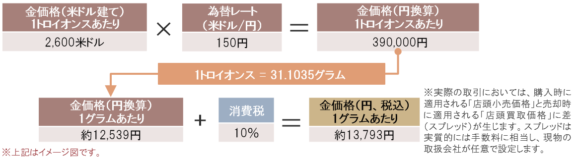 金価格は1トロイオンス当たりの価格(米ドル)で表示されます(1トロイオンス=31.1035g)。現物取引の際、日本では一般的に「1グラム当たり」の「日本円」で金価格が算出されます。