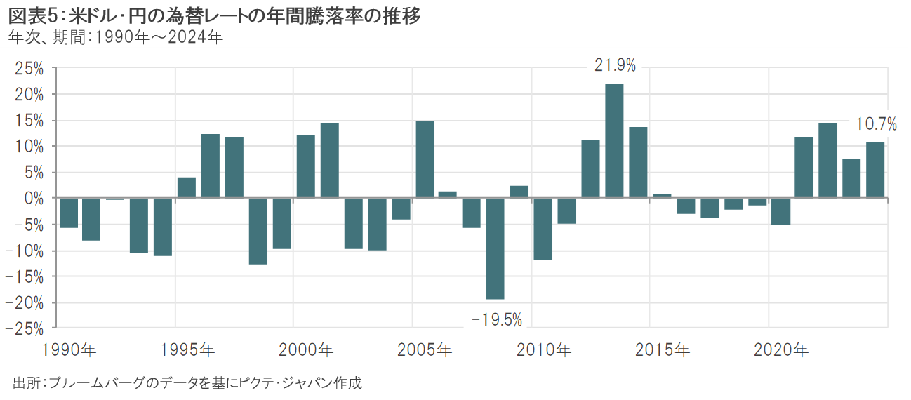 為替は比較的変動が大きく、ファンダメンタルズ(基礎的条件)から大きく乖離することもあります。1990年以降の米ドル・円の為替レートの年間騰落率の推移を見ると、最大で±20%程度の変動があることがわかります(図表5参照)。