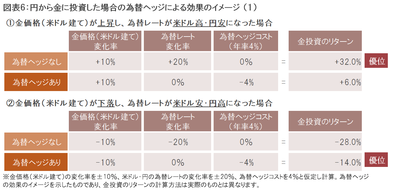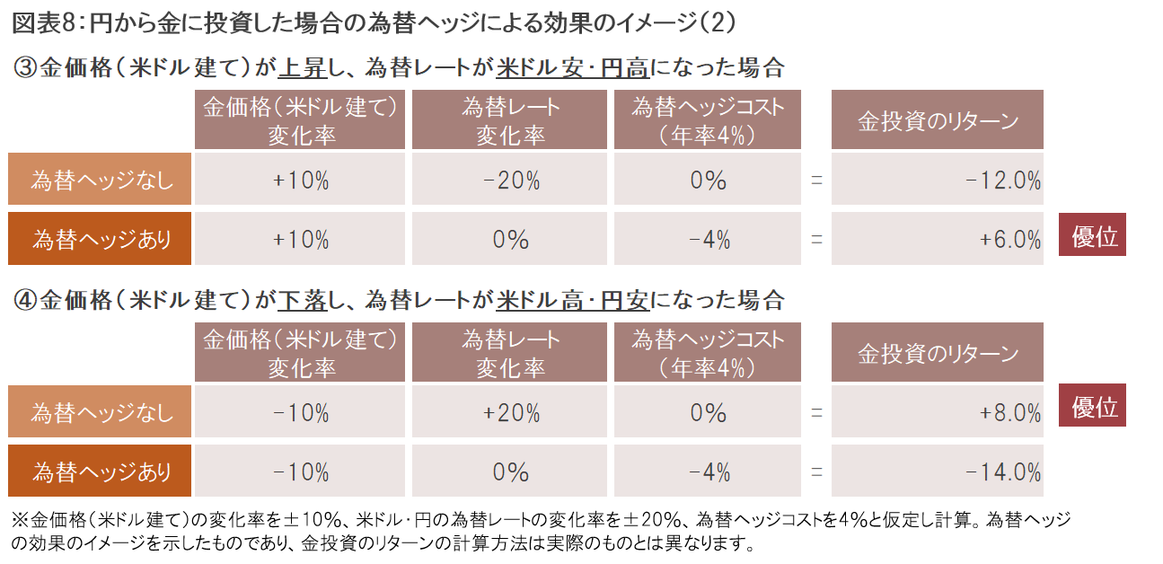 足元の為替ヘッジコストの水準を踏まえて、金価格と米ドル・円の為替レートがそれぞれ上昇/下落した場合に分けて金投資のリターンの試算を行ったところ、図表6の①で示されるように金価格が上昇し、米ドル高・円安となった場合には為替ヘッジなしが優位となりました。一方、図表6の②で示されるように金価格が下落し、米ドル安・円高になる局面においては、為替変動のマイナスの影響を抑制する効果から為替ヘッジが優位となることがわかります。