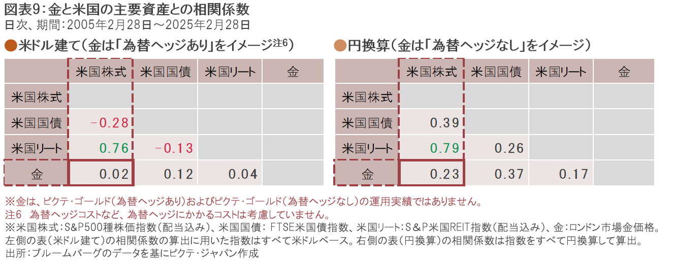 例えば、投資ポートフォリオの分散投資効果を高めることを目的に金投資を行う場合について考えてみます。金の価格は株式などの主要な資産の価格とは異なる値動きをする傾向があるため、米国株式などとの持ち合わせを行うことで、投資ポートフォリオ全体の値動きを安定させる分散投資効果が期待されます。過去20年間の金と米国の主要な資産の値動きを米ドル建てで見てみると、図表9の左側に示されているように、金と米国株式は相関係数が0.02と低相関の関係にありました。資産間の相関が逆相関(マイナス)の場合はそれぞれの資産が逆の動きをする傾向があること、相関が低い(ゼロに近い)場合は価格の動きに関連性が小さいことを意味します。このことから、金と米国株式は、分散効果が期待できる可能性のある組合わせといえます。
