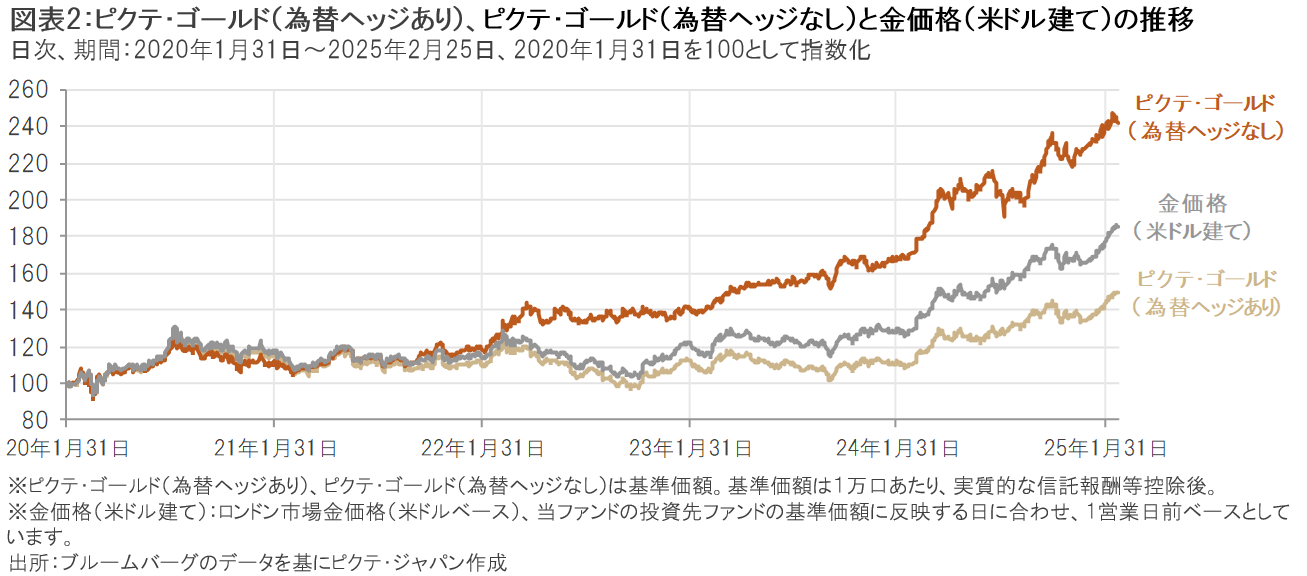 ピクテ・ゴールド(以下、当ファンド)は「為替ヘッジなし」に加え、為替変動の影響を軽減する「為替ヘッジあり」の2ファンドからお選びいただけます。過去5年のそれぞれの基準価額と米ドル建ての金価格の推移をみると、急激な円安・米ドル高が進んだ2022年以降、「為替ヘッジなし」のリターンは米ドル建ての金価格のリターンを上回りました(図表2参照)。一方で、「為替ヘッジあり」のリターンは為替ヘッジコスト(詳細は後述)の上昇などを背景として相対的に低い水準となりました。