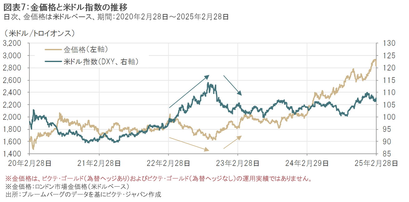 なお、金は商品(コモディティ)としての側面だけでなく、無国籍の通貨注5としての側面を持つ資産であり、基軸通貨である米ドルの代替資産と見なされることがあるため、米ドルと逆の動きをする傾向があります。金価格には景気やインフレ、金利の動向や国際情勢など多岐にわたる要因が影響を及ぼすため、全ての局面で米ドルの動きと高い連動性を示すとは言えませんが、図表7の矢印で示した期間などでは逆の動きをする傾向があったことが示唆されています。