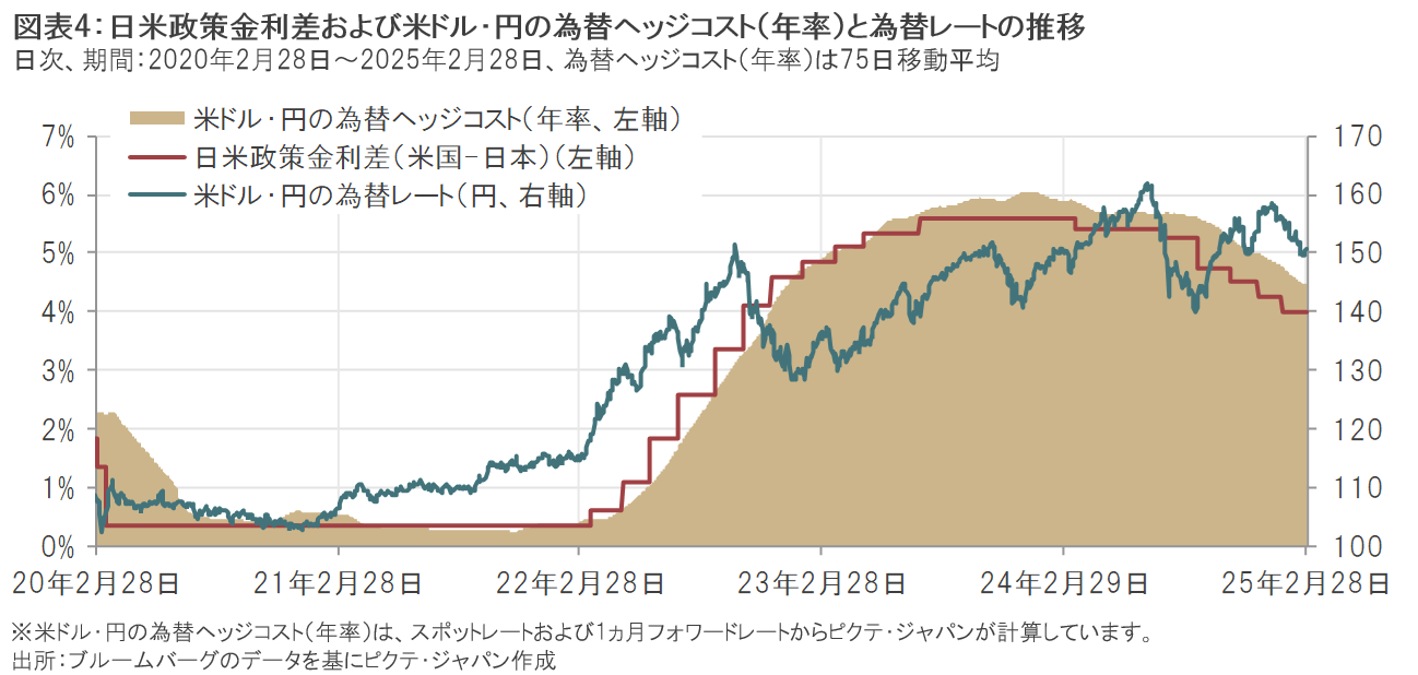 米ドル・円の為替ヘッジコストは過去との比較では相対的に高い水準にあるといえますが、為替ヘッジコストは将来の不確実性に備えるための費用であるといえ、過去の水準との比較などから単純に割高であるという評価ができるものではありません。また、米国の利下げなどを背景とする日米政策金利差の縮小に伴い、足元で低下傾向にあります。