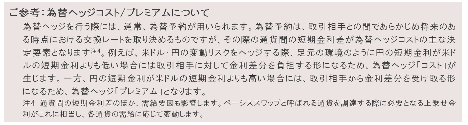 ヘッジとはリスクを回避するために行う行動で、為替ヘッジは外貨建て資産に投資する際の為替の変動による影響を抑えるために行う手段です注1。また、為替ヘッジを行うに際には一般に為替ヘッジ「コスト」の支払いが生じます注2(図表3参照)。