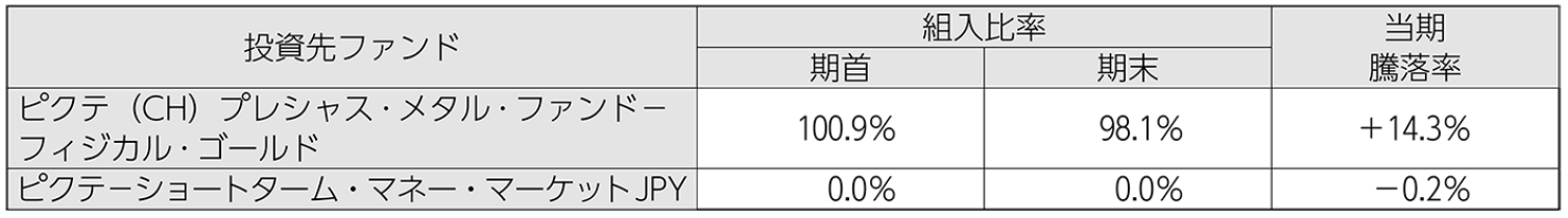 米ドル建ての投資信託証券への投資を通じて、実質的に金に投資しました。外貨建資産については、原則として為替ヘッジを行い為替リスクの低減を図りました。