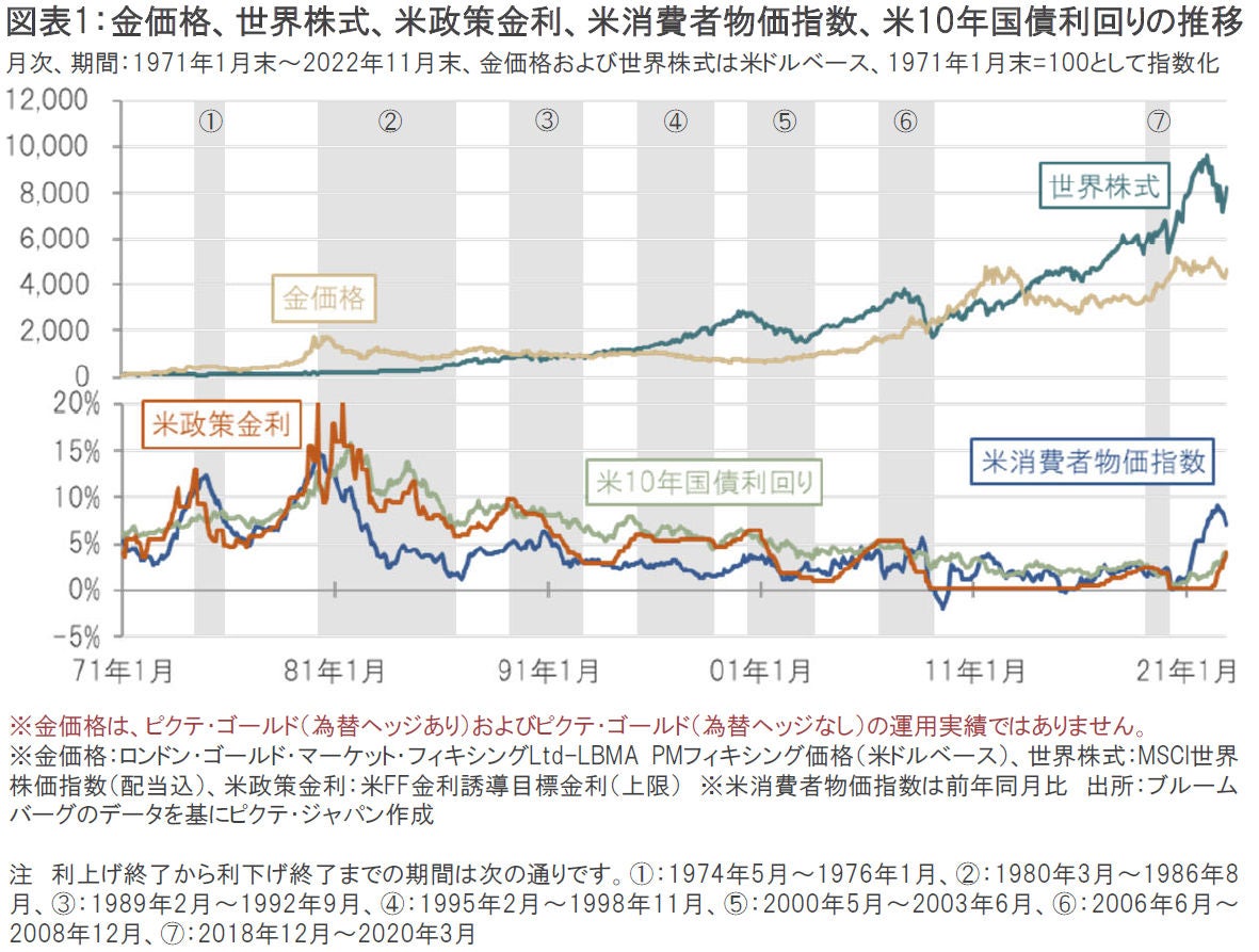 1971年以降、大きな流れでみると、米国の利上げが終了した時点は7回(①~⑦)注ありました。この7回の利上げ終了時点を起点に利下げ終了時点までの期間(図表1、灰色の影の期間)の金価格の動きをみると、2000年までの期間(①~④)では金価格は下落しましたが、2000年以降の期間(⑤~⑦)では金価格は上昇しました。