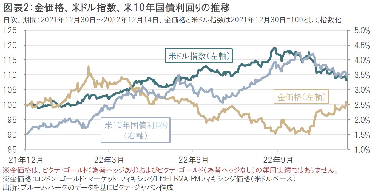 このような環境下、一時は4%を超えていた米国の10年国債利回りも足元は3.5%近辺まで低下し、米ドル指数も下落するなど、米国金利(債券利回り)と米ドルの上昇傾向は落ち着きを見せており、2022年3月から下落基調にあった金価格も反発しています(図表2参照)。