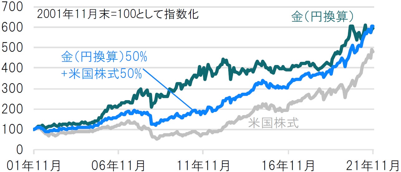 図表2:金(円換算)と米国株式、金(円換算)50%+米国株式50%の推移